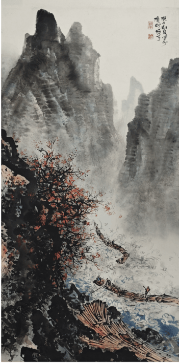 《险江筏行图》长137cm、宽68cm,是黎雄才表现岭南山水与民俗的典型作品。画面中险峰巍峨,江水汹涌,筏工们在激流中撑筏而行,人物动态生动,江水以奔放的笔墨表现出汹涌之势,山石则以 “黎家山水” 的斧劈皴刻画得刚劲有力。红色的树木与人物服饰点缀其间,既增强了画面的视觉冲击力,又体现了岭南画派的色彩特色,是黎雄才将写生实景与传统笔墨结合的佳作,展现了他对山水气势与人文生活的生动描绘。