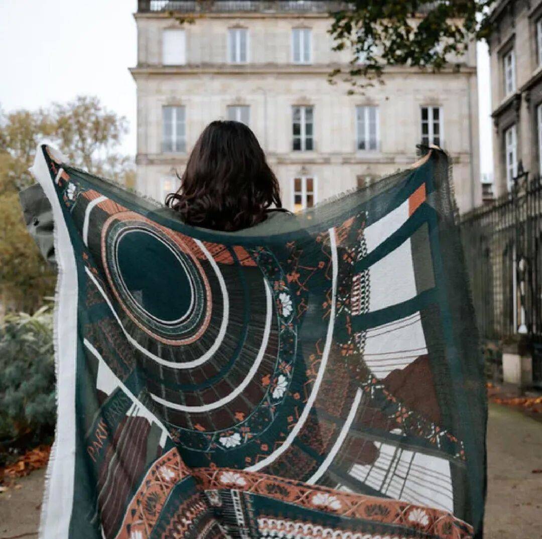 “巴黎印象”的图案设计有着建筑美感,灵感取自巴黎大皇宫标志性的玻璃穹顶。披在身上低调雅致,带有几分“老钱风”的沉稳与贵气。