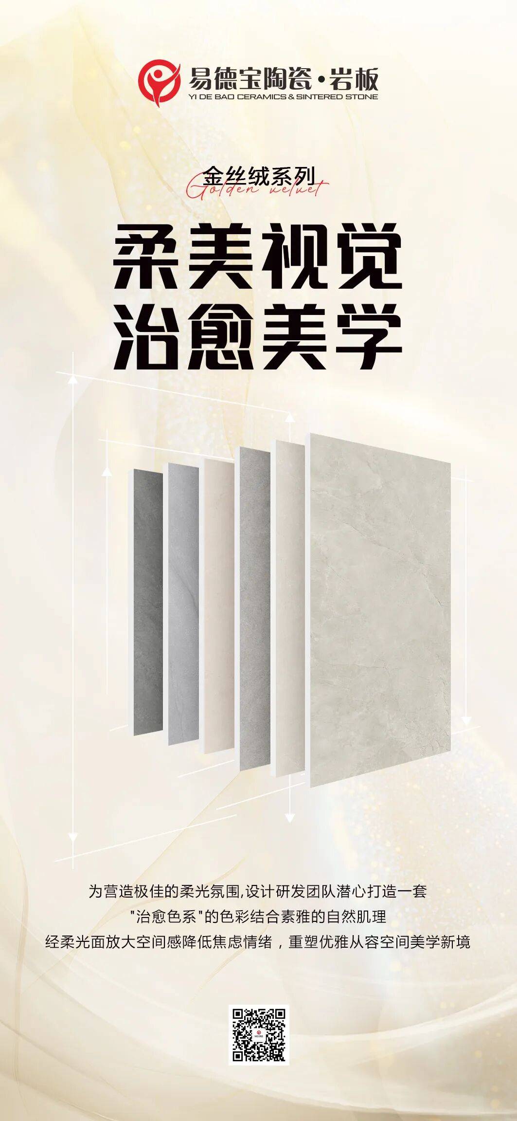 易德宝陶瓷始终秉持创新精神,不断推动产品从视觉到触觉、再到整体美感的全面进化。我们以精益求精的工艺、对细节的严苛把握以及前瞻性的研发理念,陆续推出至尊白·超平釉、金丝绒瓷砖、雅韵木纹、大板瓷砖等一系列高品质产品,子母配套,规格齐全,为消费者提供更加丰富和多元的装修选择方案。