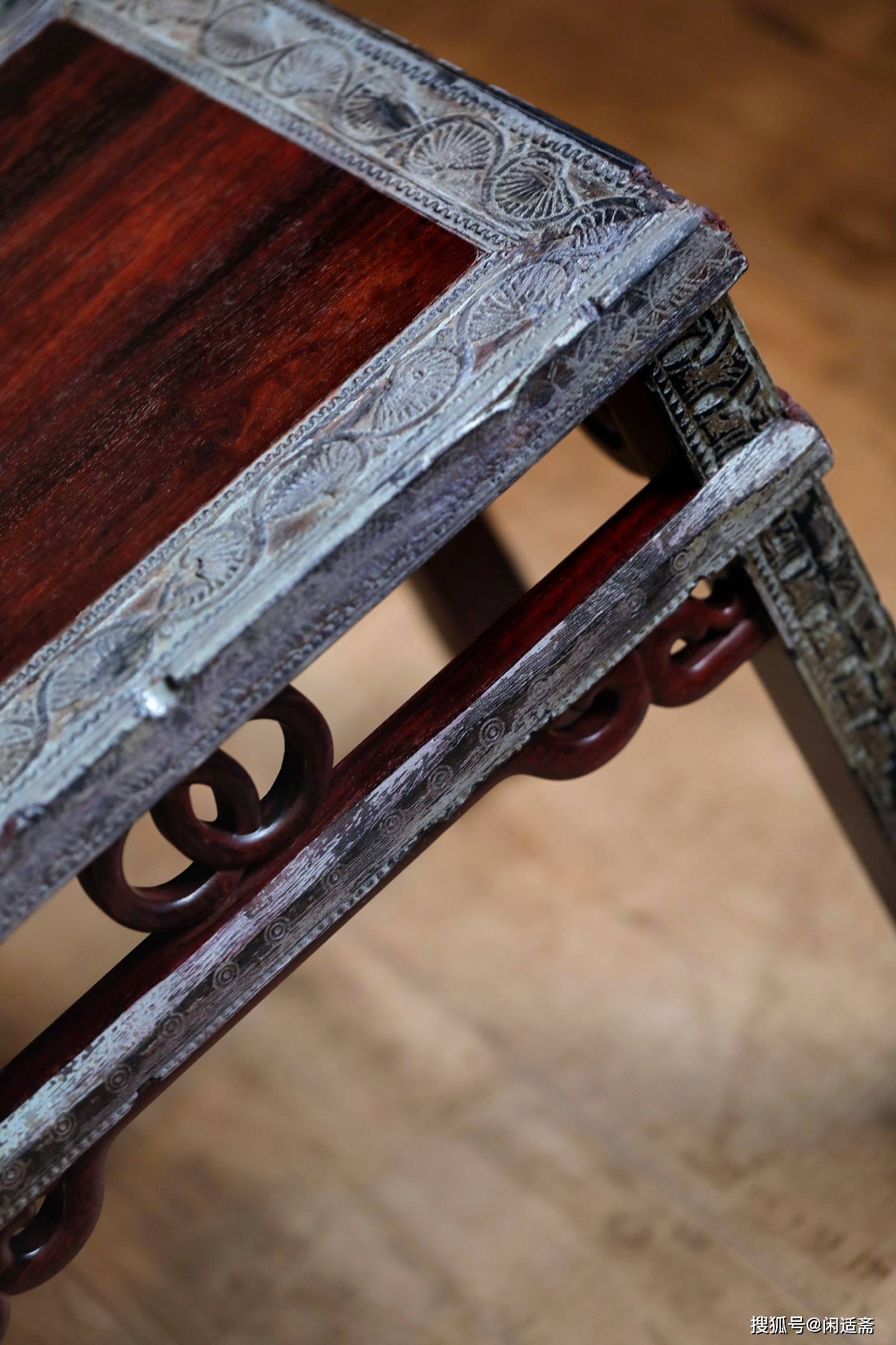 方凳的纹饰设计堪称“古韵与异域风情的巧妙共生”,既保留中式传统韵味,又融入独特的文化元素。凳面框与腿足之上,匠人精雕细琢着印度旧时代的银杏叶与莲花花纹——银杏叶纹路舒展流畅,边缘打磨得圆润细腻,似有叶片的轻薄质感;莲花花瓣层叠错落,线条柔美婉转,尽显“出淤泥而不染”的清雅寓意。这些异域纹样与中式经典纹样相得益彰:凳面转角处的如意纹线条优美,寓意“称心如意”;横枨间的卡子花以双环扣装饰,既起到装饰作用,又强化了结构稳定性,两种纹样一柔一刚,让纹饰层次更显丰富。