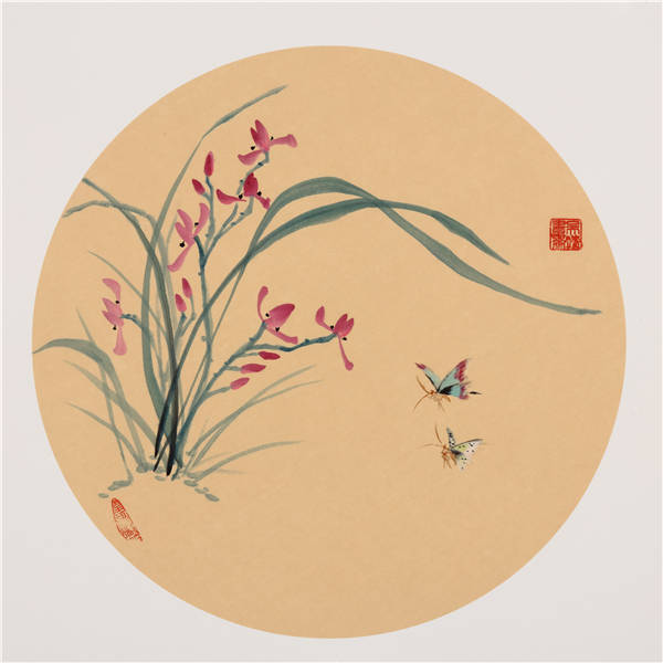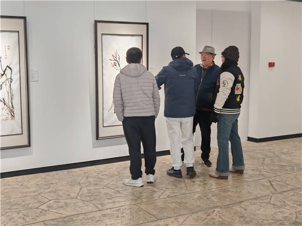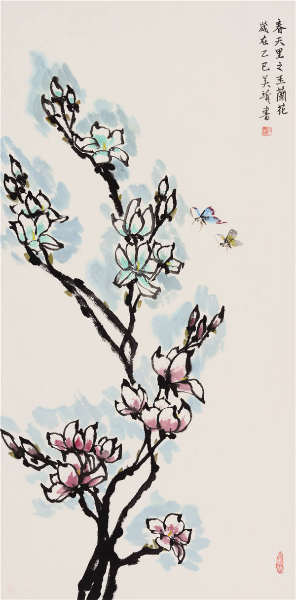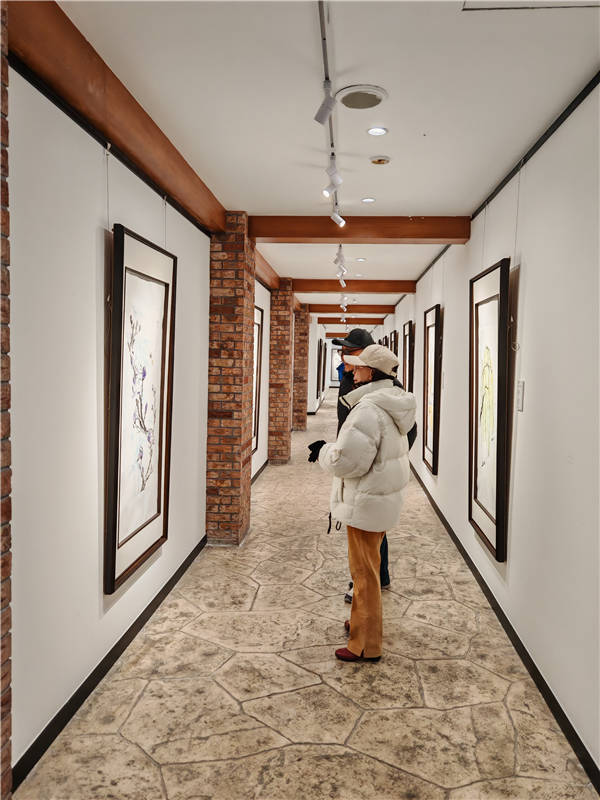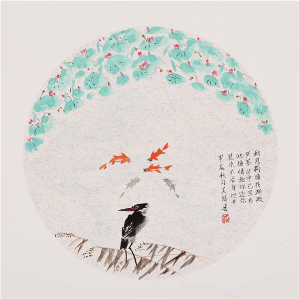 吴靖的参展作品以“春、夏、秋、冬”为明晰脉络,构筑起一场四季的诗意轮回。每幅作品均配有自题诗作,形成“画为视觉之诗,诗为文字之画”的互文关系:从《春天里之紫藤花》的蝶舞藤蔓,到《仲夏荷塘盛花》的鸟戏莲叶;从寓意秋日的绚烂枝干,到《初冬月夜》的鹤栖梅枝。艺术家以水墨为媒介,通过精妙的构图与色彩,将自然意象的生机、繁盛、静美与清寂娓娓道来,邀请观者步入一个画意与诗情共鸣的时空画廊。