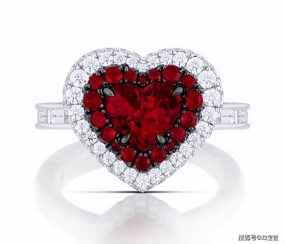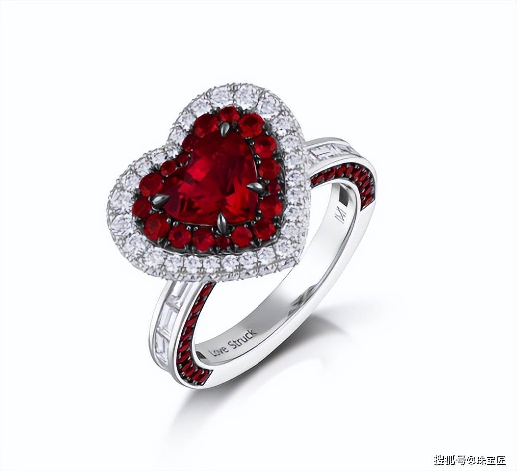 主石是一颗1.74克拉心形莫桑比克红宝石,未经过加热处理,外围环绕一圈总重1.22克拉的红宝石和一圈总重0.8克拉的圆钻,进一步增强整体的视觉冲击力,使得主石看起来更大、更突出。