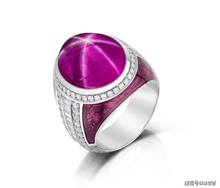 本次获奖的这枚【Rock Star】铂金戒指,主石是一颗24.63ct弧面切割星光红宝石,经鉴定,这枚红宝石原产于斯里兰卡,未经过加热处理,红宝外围及戒臂点缀圆钻和矩形钻石,戒臂绘制花纹,超大的主石,硬朗的线条,非常适合男性佩戴或去参加各种商务场合。
