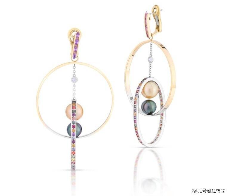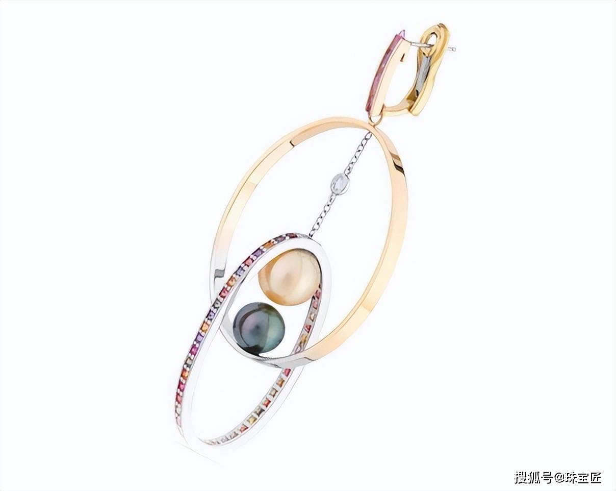 黄金环与铂金环相互套叠,两环中间镶嵌一颗尺寸略大的南洋金珠和一颗尺寸略小的大溪地黑珍珠,乍一看,给人一种悬浮感。
