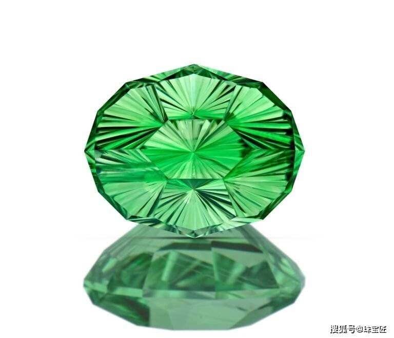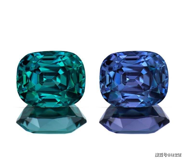一颗采用枕形切割的变色锆石,重12.91克拉,颜色从绿色逐渐变为蓝色调,来自3090 Gems的Bryan Lichtenstein雕刻。