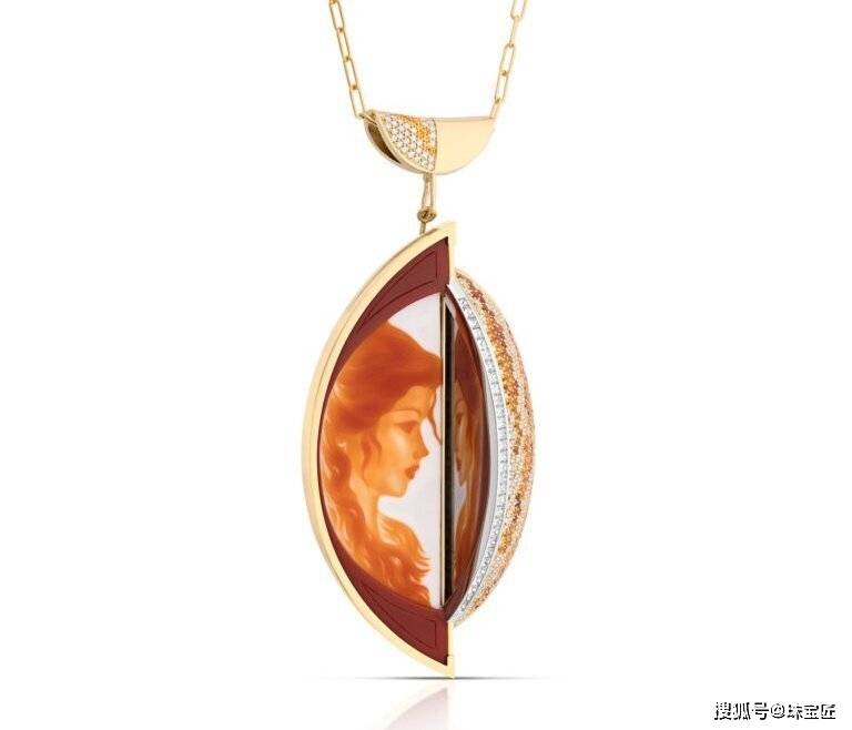 吊坠上,手工雕刻的玛瑙浮雕呈现出女性那娇美、忧郁的面容,搭配定制切割的 “镜面” 石英,形成 “人像 + 镜像” 的视觉效果,呼应“镜中之人(Face in the Mirror)”这一主题。