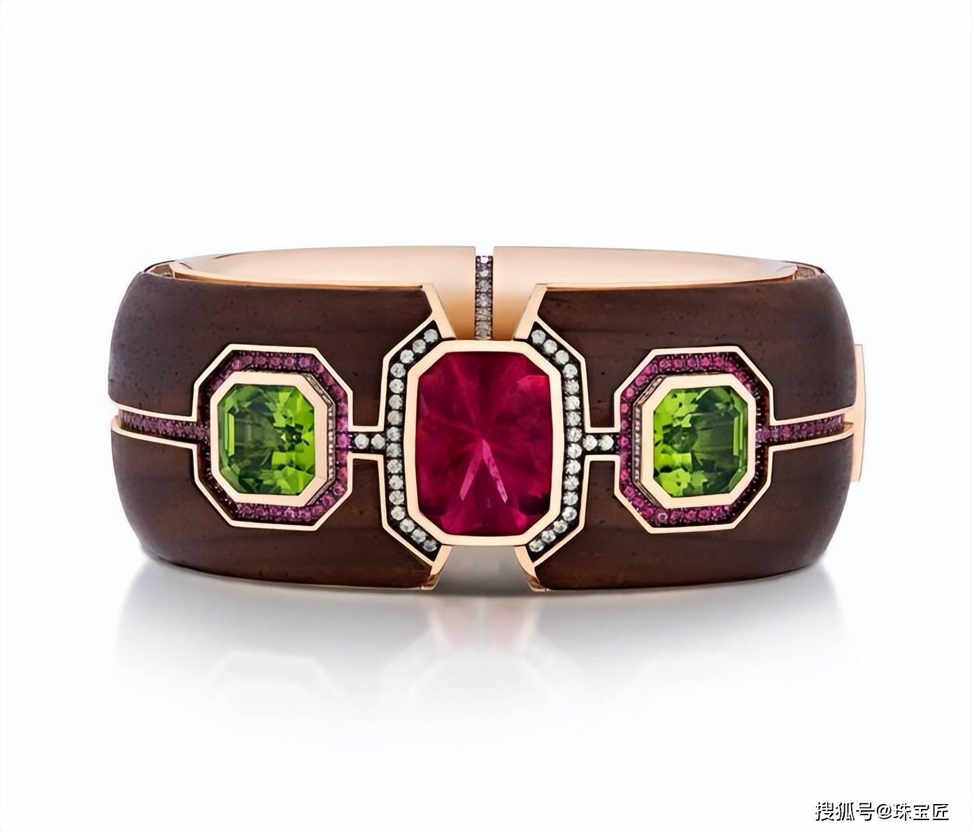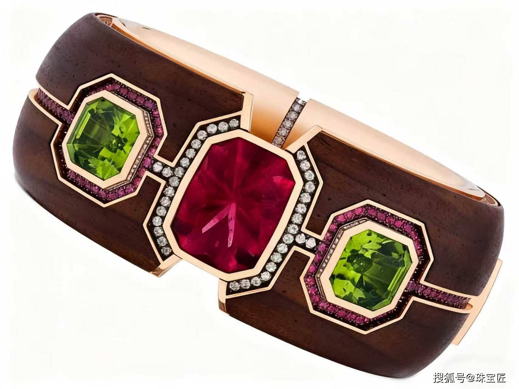 手镯的正中镶嵌14.16克拉粉碧玺、2颗总重12.77克拉橄榄石,四周环绕小克拉的钻石、尖晶石和石榴石,彩宝的色调与手镯的整体风格相得益彰,进一步提升了手镯的艺术价值和审美水平。