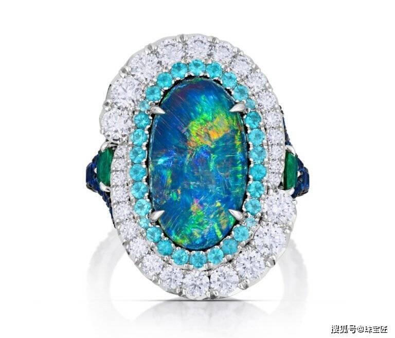 戒指的主石是一颗重8.83ct克拉的弧面切割澳大利亚黑欧泊,大小均匀、呈现霓虹蓝色调的帕拉伊巴碧玺环绕在黑欧泊的周围,形成了一个美丽的环形光晕,外围从小到大渐变的钻石,进一步增强了戒指的体量感。