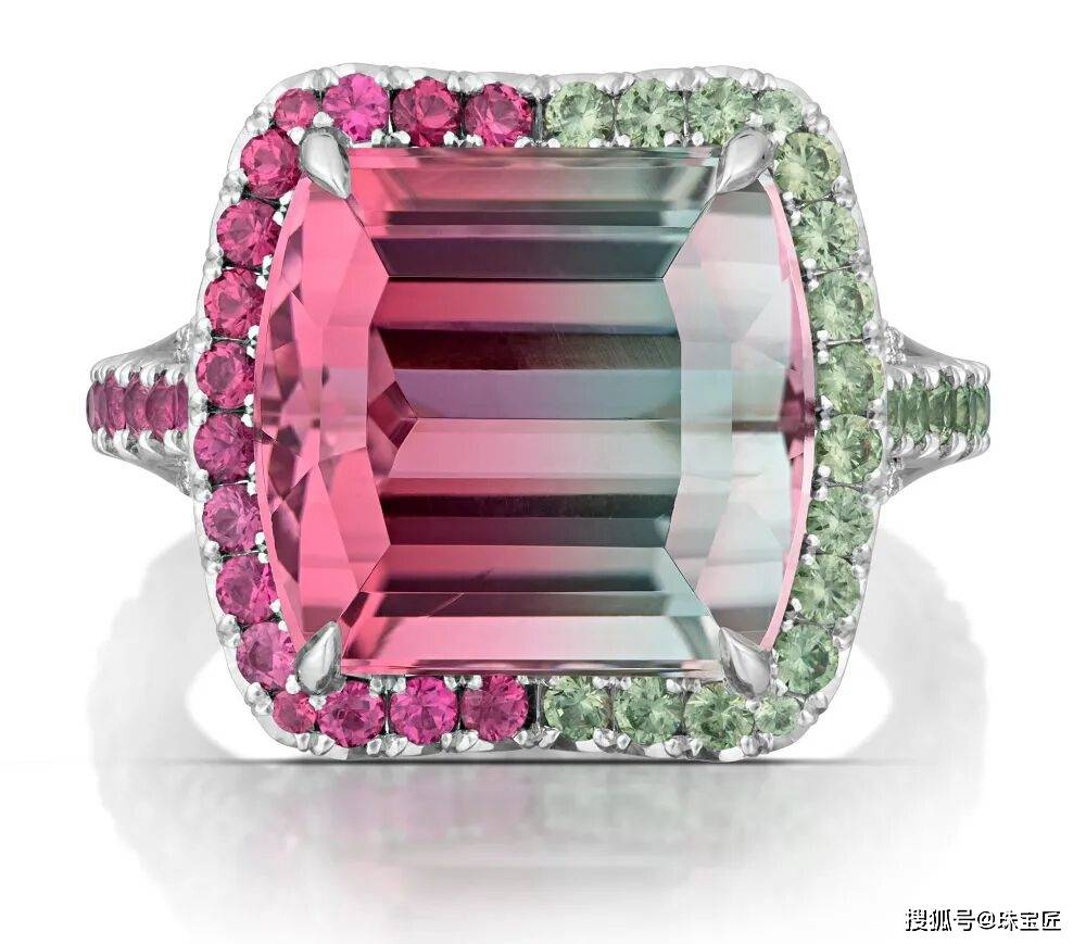 一颗重19.34克拉的菱锰矿,采用祖母绿形切割,呈现出浓郁的粉红色调,出自Brad Payne & Jay Medici之手。