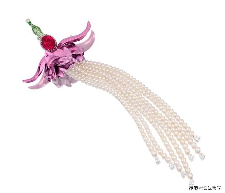 以 “紫红色花朵” 为仿生原型,一颗5.5克拉的红碧玺镶嵌在花朵上,上方配镶沙弗莱石、粉色蓝宝石和钻石,花朵下方的珍珠流苏,还原了花朵的柔美质感,又通过流苏演绎灵动。