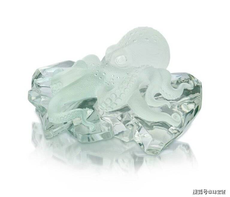 重达 1423 克的蓝色托帕石上,雕刻出章鱼盘踞在冰块上的场景,章鱼触角上的吸盘与纹理、以及冰块里面的气泡,也被精细雕刻,整体造型将宝石的 “透” 与雕刻的 “实” 相结合,既保留了托帕石本身的清冷通透之感,又通过立体雕刻,赋予宝石叙事性与艺术张力。