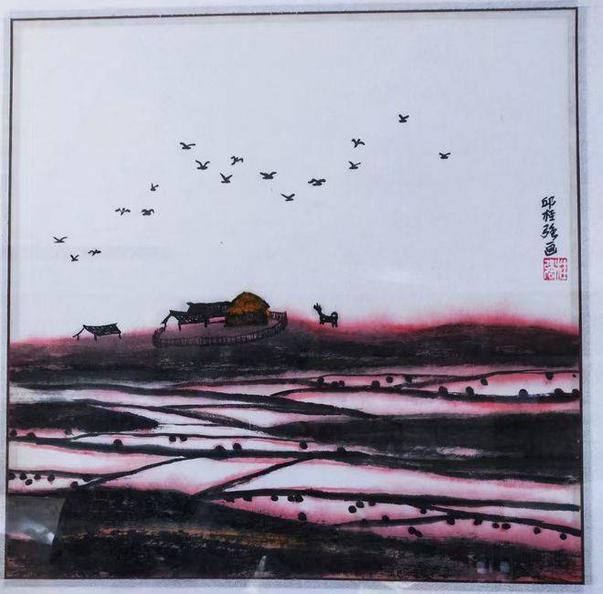 - 山水画:以北方山水的雄浑壮阔与南方田园的灵秀婉约相融合,运用积墨厚色构建层峦叠嶂的壮阔景象。代表作《雄伟宏图》被国家博物馆收藏,墨色酣畅淋漓,线条遒劲洒脱,既承袭荆浩、关仝的笔力,又借鉴董源、巨然的古润意境,形成“气势雄浑,大气磅礴”的视觉张力。田园题材如《风和日丽》则以简率洒脱的笔触描绘阳光明媚的田野,通过色墨交融与空间延展,营造“一望无际、延绵千里”的辽阔意象,传递宁静致远的文人情怀。