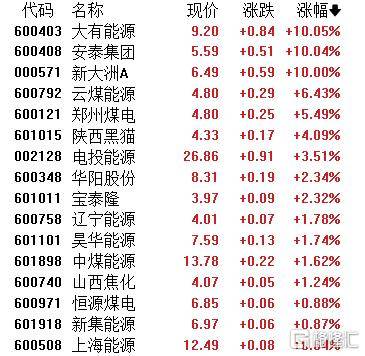 煤炭股表现强势,大有能源、安泰集团、新大洲A涨停,云煤能源、郑州煤电、陕西黑猫、电投能源、华阳股份等跟涨。