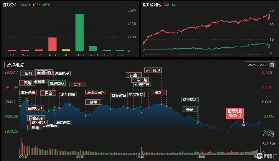 12月3日,A股三大指数集体下挫,沪指跌0.51%报3878点,深证成指跌0.78%,创业板指跌1.12%。沪深两市成交额1.67万亿,较上一个交易日放量765亿,逾3800股下跌。