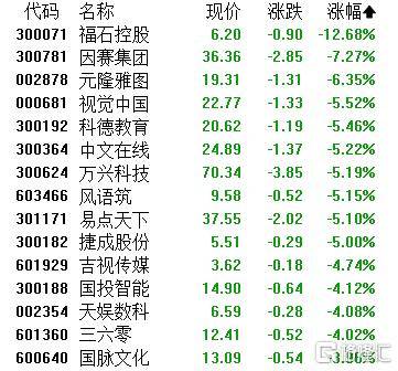 Sora概念跌幅居前,福石控股跌超12%,因赛集团、元隆雅图、视觉中国、科德教育、中文在线等跟跌。