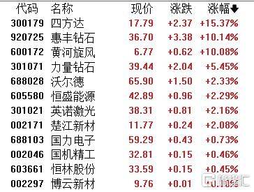 培育钻石板块逆市飘红,四方达涨超15%,黄河旋风涨停,惠丰钻石、力量钻石、沃尔德、恒盛能源、英诺激光等跟涨。