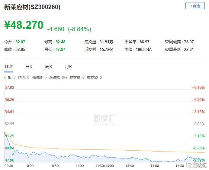 新莱应材跌8.84%,股价跌破50元关口,创近2个月新低,总市值下破200亿元大关。