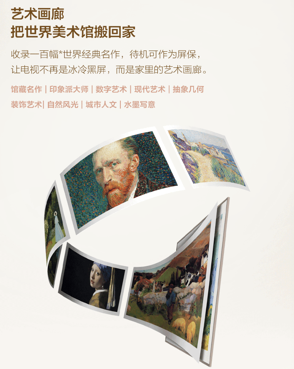 更惊艳的是其内置的艺术画廊功能,100幅免费世界名作涵盖馆藏珍品名作、现代艺术、数字艺术等多种类型,待机时自动变身艺术屏保,彻底告别传统电视黑屏的冰冷感。动态名画功能更是神来之笔,让静态名画直接在眼前“活”起来,瞬间将客厅打造成私人美术馆。这种沉浸赏画体验,比去卢浮宫排队看展还要治愈。