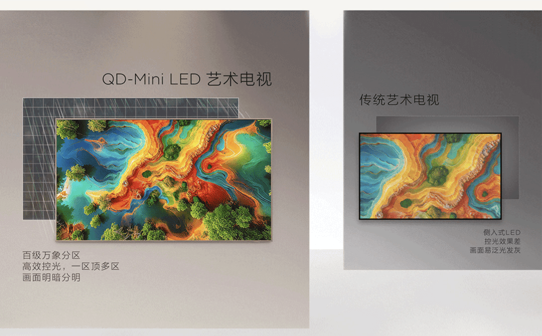 而且它的价值,远不止是“一幅画”。过去,艺术电视的通病是为了轻薄牺牲画质,但A400 Pro凭借TCL自研QD-Mini LED技术,彻底打破“颜值与画质不可兼得”的魔咒。它搭载万象分区控光系统,从发光芯片到屏幕实现全链路精准调校,亮区与暗区独立控制,既能保证高光不过曝,又能让暗部细节尽显,画面层次感拉满。配合量子点Pro技术,通过纳米级发光晶体与多层护膜封装,实现更广色域、更高色彩纯净度与更强稳定性。无论是看影片还是欣赏画作,色彩都能被精准还原。