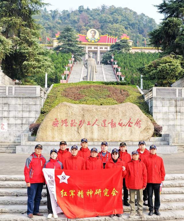 一座纪念馆 红了半座城。这是湖北红军精神研究会的部分会员站在萍乡市安源在《毛主席去安源》的巨幅雕像前留影。