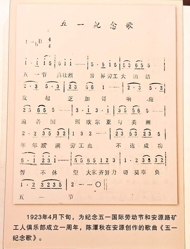 那年的五一节就要到了,中共安源地委邀请陈潭秋参加纪念五一节活动筹备会,会上有人说,年年纪念五一节,总是组织工人唱唱老歌,不出新也不出彩。如果能有一支自己创作的五一歌,再请人谱曲,教工人们自己学会唱那多好,五一节过了也还能唱的,随时能鼓舞和激励工人。陈潭秋看着开会的人都沉默不语,他觉得应该承担下来,起身对大家说,我刚来安源不久,熟悉情况后让我试试,我先拿出初稿来,大家帮我修改,再找人谱曲好不好。会场立即有人说,谁不知道陈老师是个大知识分子,你就别谦虚了,我们就等着听好歌吧。说着,掌声充满了整个屋子。