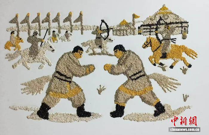 吴淑丽的粘贴画技艺传承自母亲和外婆。她告诉记者,她在创作中既保留传统拼贴技法,又创造性地将小米筛选成小、中、大粒3类,并染成24色,以此为原料创作小米贴画作品。“颜色鲜艳、立体感强,且可长期保存,小米贴画技艺因此也焕发出新的生机与活力。”