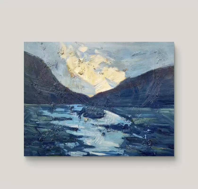 对自然色彩的极致捕捉,是他艺术创作的源泉。吕文扬有着一双“发现色彩的眼睛”,他常年带着画板穿梭于山川湖海之间,从黎明破晓时天际的渐变色,到黄昏时分稻田里的暖橙光晕;从雨后山林中青苔的湿润绿,到雪原之上冰晶折射的冷蓝辉光,都被他细致地收录在速写本中。他创作的《晨雾漫山》系列,以数十种层次各异的绿色为主调,从浅草绿到墨绿,从青柠绿到橄榄绿,通过色彩的叠加与晕染,让山间晨雾的朦胧与生机跃然纸上。看过这幅画的人都感叹:“仿佛能闻到雨后山林的清新,感受到雾气拂过皮肤的微凉。”