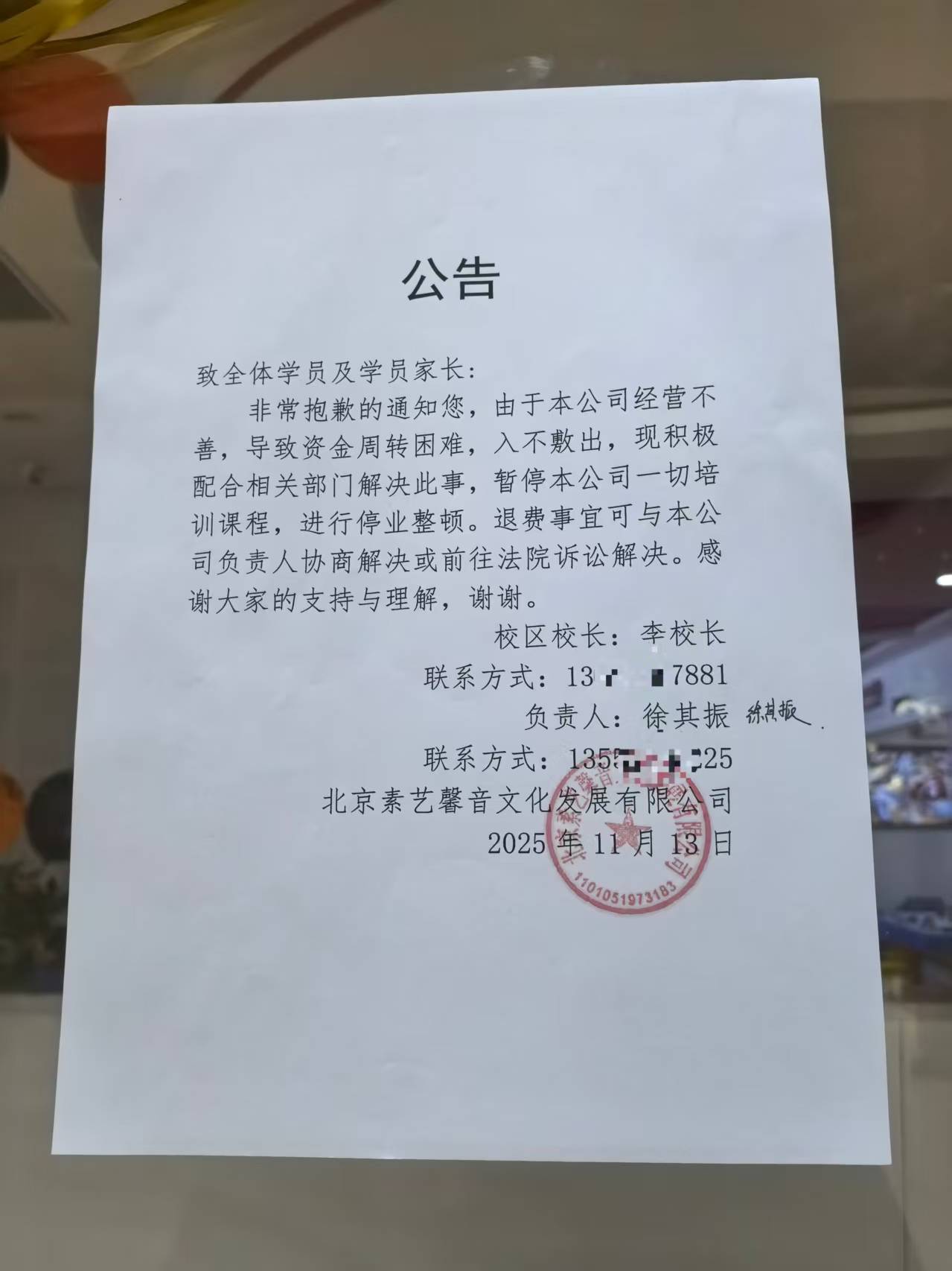 目前,在一些平台上仍能搜到该机构,其全称为“中国歌剧舞剧院艺术培训中心(西城区基地)”,在其停业公告末尾,落款则为“北京素艺馨音文化发展有限公司”。