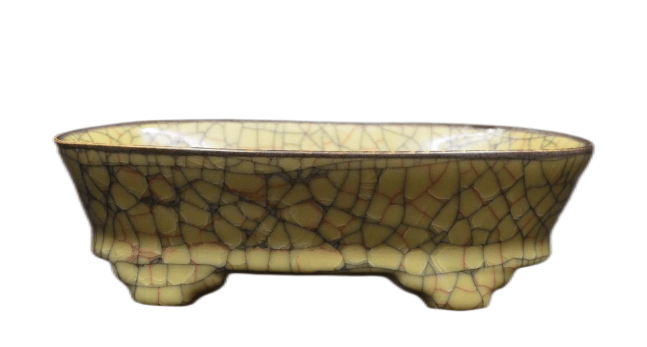 水仙盆高7㎝,口径长24.3㎝,底径宽14.1㎝。侈口,斜壁,椭圆形,平底,四云头形足。紫口铁足,米黄色釉,开片纵横交错,深浅不一,釉质纯厚,气泡较大,微观气泡老化痕迹明显。(量子年份检测北宋晚期)