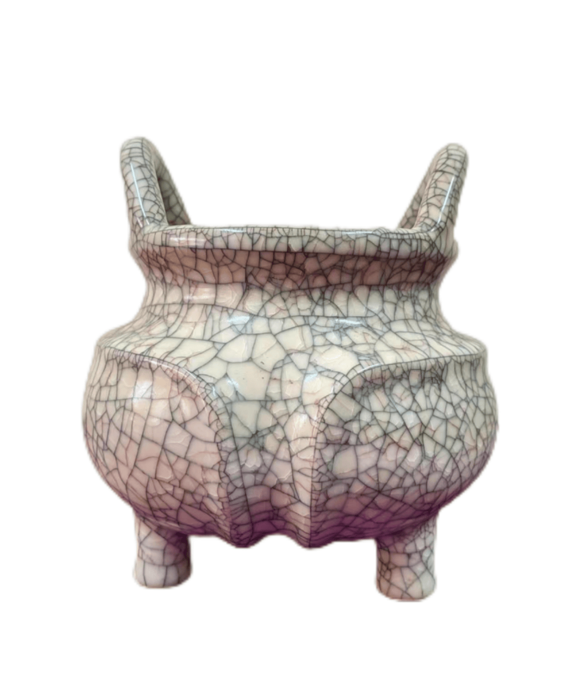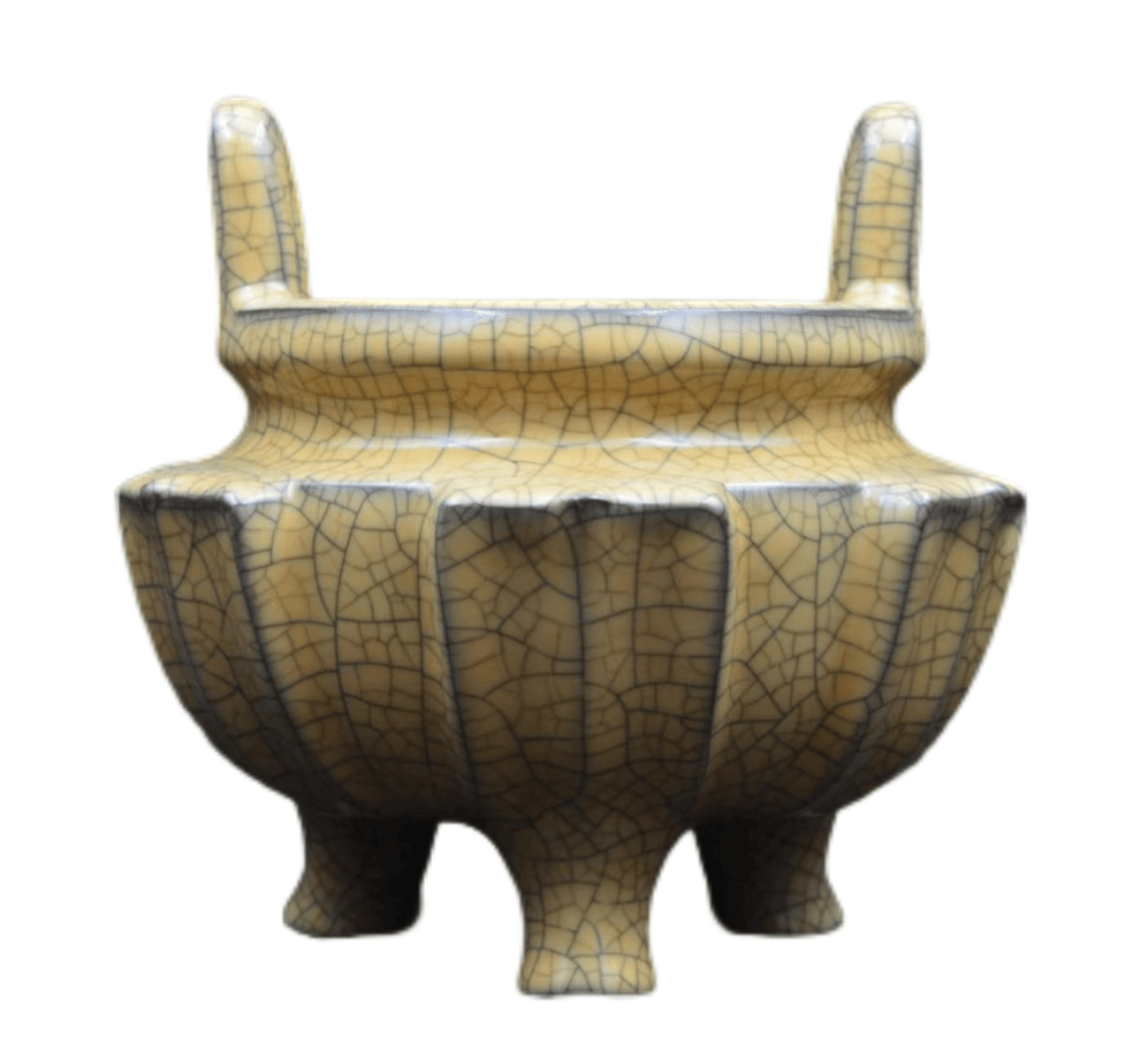 炉高19㎝。立耳,直口,束径,丰肩,瓜棱形腹,蹄形三足。内外施米黄釉,开细小片纹,胎体厚重,器型饱满,线条流畅。(量子年份检测北宋晚期)