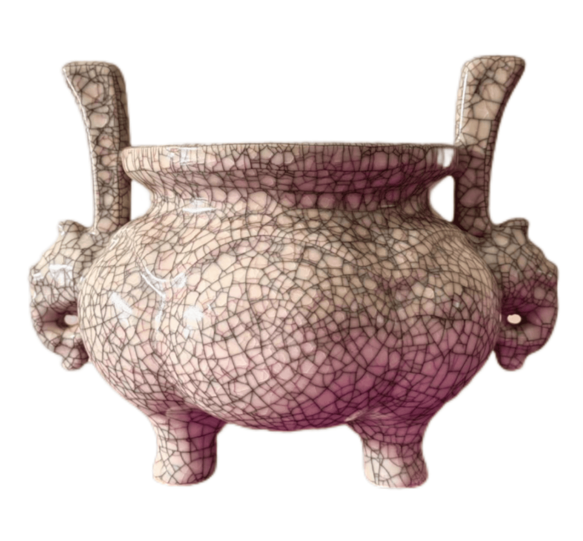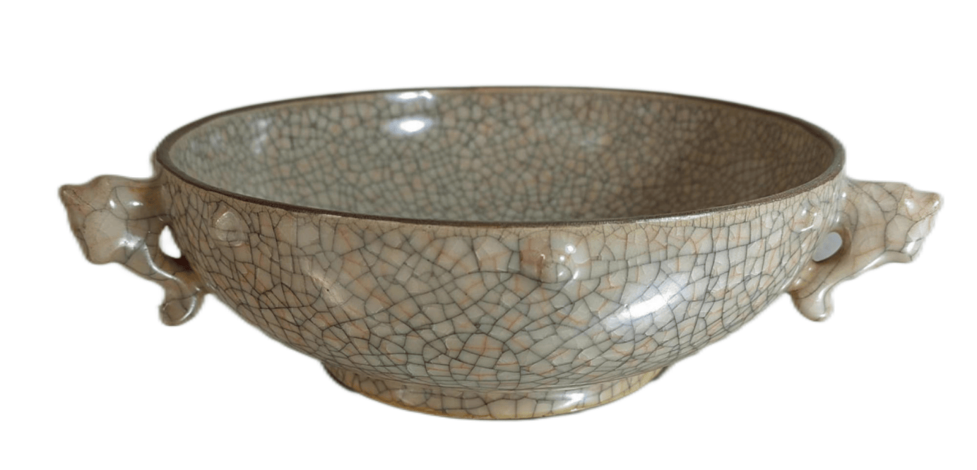 哥窑青瓷釉细碎的开片称为“百圾碎”,更小的叫做“鱼子纹”,俗称金丝铁线,有的形成紫口或铁足。哥窑瓷器的开片不仅是缺陷转化的艺术,更是宋代极简美学的体现。目前,对哥窑瓷器的认识,一是零碎的古代文献记载,二是有限的馆藏哥窑瓷器,三是收藏家收藏的类似哥窑器物。其器型主要有杯、炉、洗、盘、碗、罐、瓶等;釉色主要有米黄、月白、茄皮紫、红釉等色;胎体颜色分黑灰、浅灰、深灰、土黄等色。宋代哥窑瓷器的烧造温度在1250度左右,以手扣之声音有点木哑。哥窑瓷器有带款的,也有不带款的。带款的有“大宋哥窑”(篆书)、“大宋御哥”(篆书)。宋代哥窑红釉属款有:“崇宁元年皇宋官窑御制”(篆书)、“宣政年间开封府督造东京官窑归于天成宋徽宗御贡”(楷书)、“大宋哥窑”(篆书)。哥窑由宋太祖赵匡胤时创建,太祖驾崩后,继任者宋太宗帝(太祖之弟)将该窑皇家后烧器物具以“大宋哥窑”、“大宋御哥”铭文,在规制上是符合皇室礼数的,试想,在皇权至上的宋代,除他们哥俩外,谁还敢被皇帝尊称为御哥呀!并且还以特别的形式置于重器之上(底款标注很明确)。关于宋代哥窑瓷器的烧造年代,有“龙泉章氏兄弟各主窑事,老大张生一所开的窑厂即为哥窑,老二章生二所开的窑厂即为弟窑”的论证,其无论是否历史巧合,那都是南宋的事了。故,从器型和制作工艺及科技量子年份检测时间判断,宋哥窑烧造年代并非始于南宋,而是北宋早期。宋代哥窑器物存世量较之宋代汝、官、钧更少,件件皆珍。