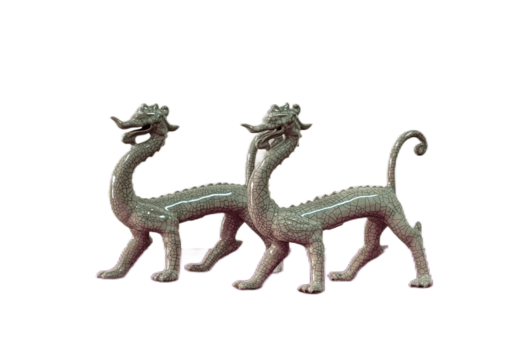 立龙摆件高20㎝,长22.3㎝,宽8㎝。昂首挺立,圆眼前视,上颚微翘,下颚下卷,龙发上扬,体态肥硕,尾巴扬而下卷,三爪,四肢粗壮有力,伸展舒张,腹下方框内竖行篆书“大宋御哥”四字印章款。施米黄色釉,开细碎片纹,釉面光滑。(量子年份检测北宋早期)