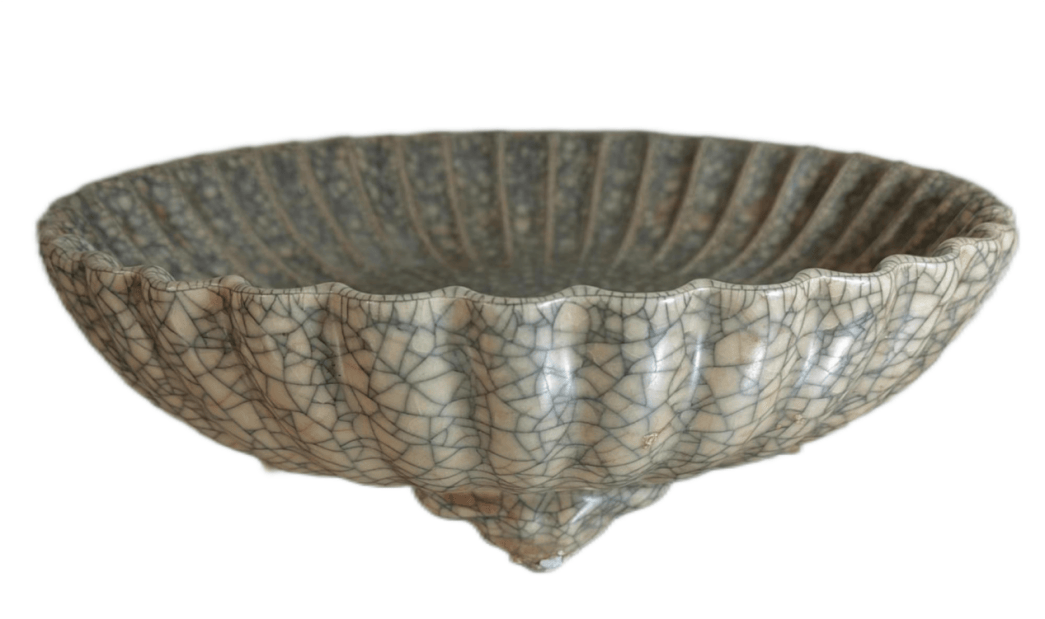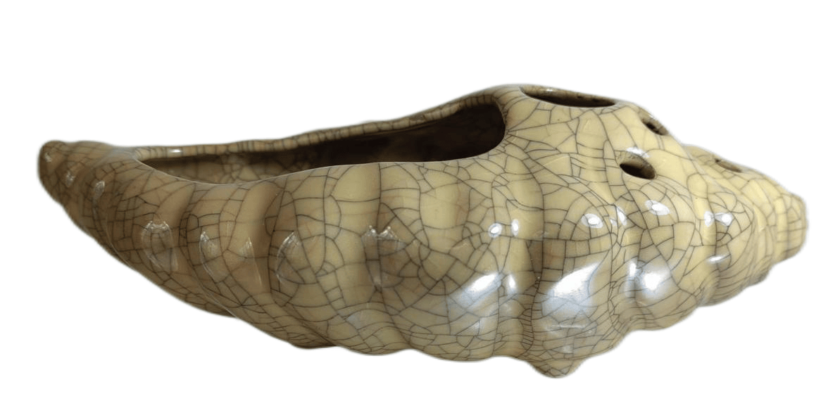 洗高7.02㎝,长21.4㎝,宽10.67㎝。海螺状,螺纹九层,上端开口一大六小,构思巧妙,造型逼真。施米黄色釉,开细碎片纹,应为宫廷文房用器。(量子年份检测北宋早期)
