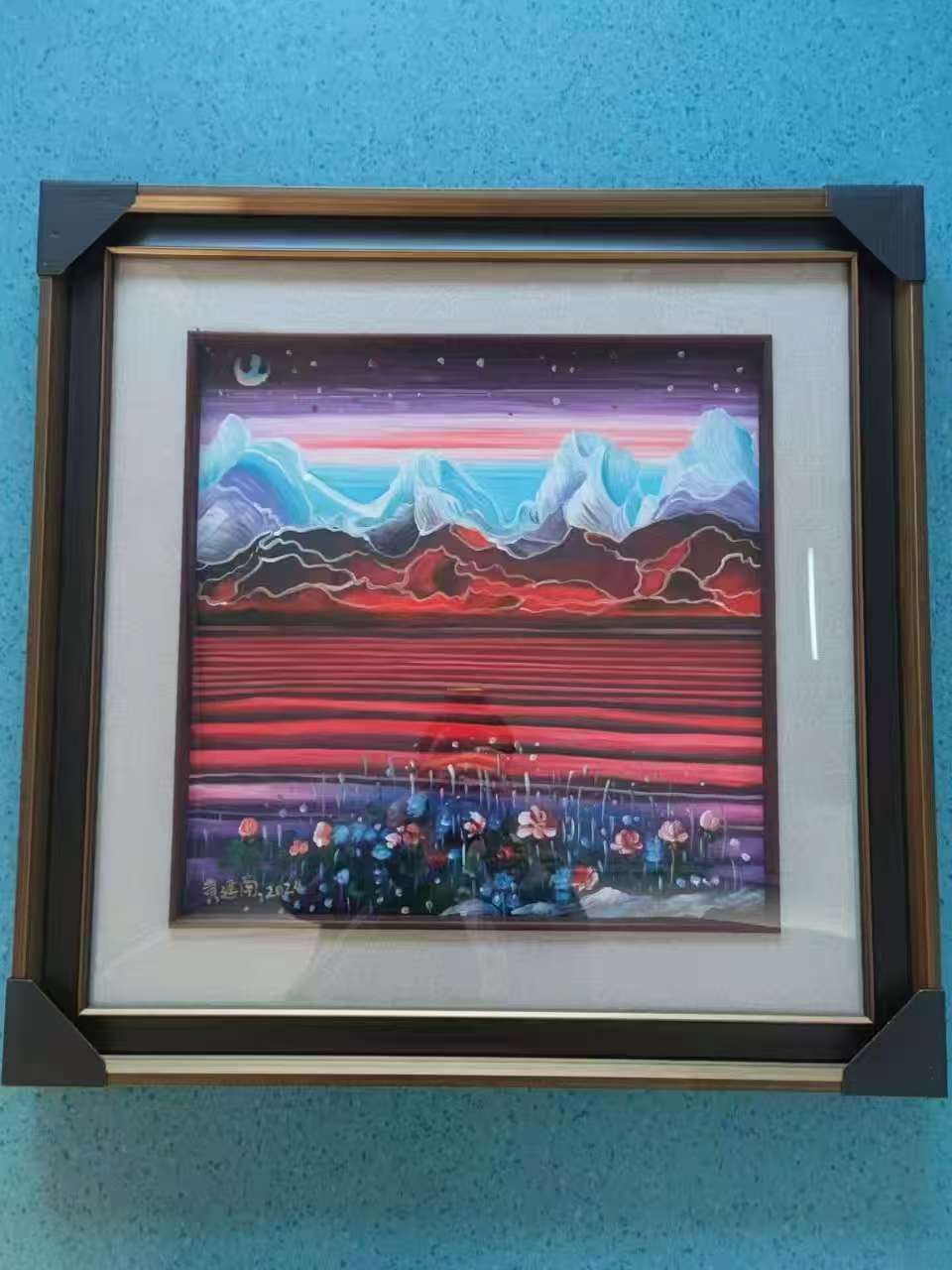 他的作画手法是其独特意境得以实现的关键。黄建南在油画技法上进行了大胆而个性化的探索。他创造性地运用了类似中国画中“泼彩”、“晕染”的技法,让油彩在画布上自由流淌、渗透、叠加,形成自然天成的肌理与变幻莫测的色彩层次。同时,他也注重笔触的表现力,时而如书法般挥洒有力,时而又细腻微妙,通过点、线、面的复杂交织,构建出富有音乐韵律感的画面结构。他对色彩的运用堪称一绝,敢于使用高饱和度、对比强烈的颜色,却又能在冲突中求得和谐,营造出流光溢彩、璀璨夺目却又深邃神秘的视觉效果。这种手法,打破了传统油画对形体与空间的常规塑造,更侧重于氛围的渲染、情绪的传达和意境的生成,使画面本身成为一个充满能量场和精神感召力的独立世界。