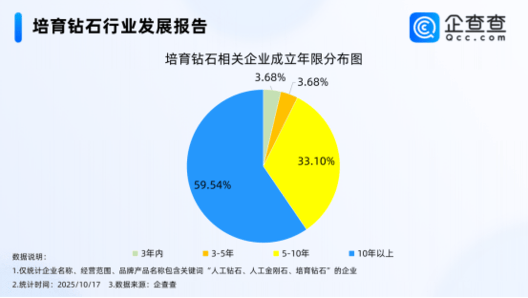 同一时期,培育钻石市场也在遇冷,根据贝恩咨询的《2025全球钻石报告》,培育钻石裸石市场规模大幅缩水52%,曾经火热的培育钻石裸石市场也光环不再。企查查显示,今新企业注册量显疲态,2024年仅新增15家,今年以来更是只有7家。国内现存873家培育钻石相关企业中,近六成已是成立10年以上的老牌企业。