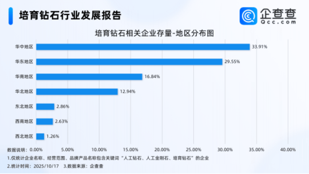 与传统钻石回收市场的困境一样,培育钻石市场同样面临挑战。根据贝恩咨询的《2025全球钻石报告》,培育钻石裸石市场规模大幅缩水52%,曾经火热的培育钻石裸石市场也光环不再。企查查数据显示,国内现存培育钻石相关企业873家,近六成是成立10年以上的老牌企业。这些企业多集中在华中地区和华东地区,分别占比33.91%和29.55%。在注册资本方面,培育钻石企业多为轻量级企业,注册资本在100万元以内的企业占比达30.68%。然而,新企业注册量却显疲态,2024年仅新增15家,今年以来更是只有7家。