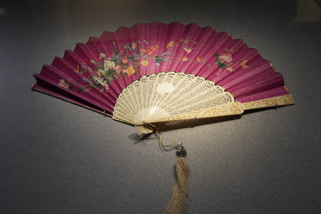 展览现场 清象牙柄徽章留白绫面彩绘人物花鸟折扇