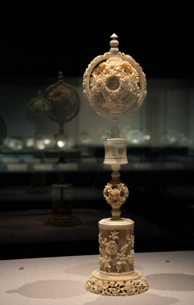 比如展出的一件清代象牙雕上下双活多层牙球摆件是广州最具代表性的牙雕制品“鬼工球”(即套球)工艺的代表作。早在1915年美国旧金山世博会上,广州牙雕艺人翁昭创作的26层镂空透雕象牙套球获得金奖。眼前这件牙雕摆件拳头大小的圆环内套16层“鬼工球”一枚,每层均镂12圆孔,层层可转,让人惊叹其技艺之鬼斧神工。