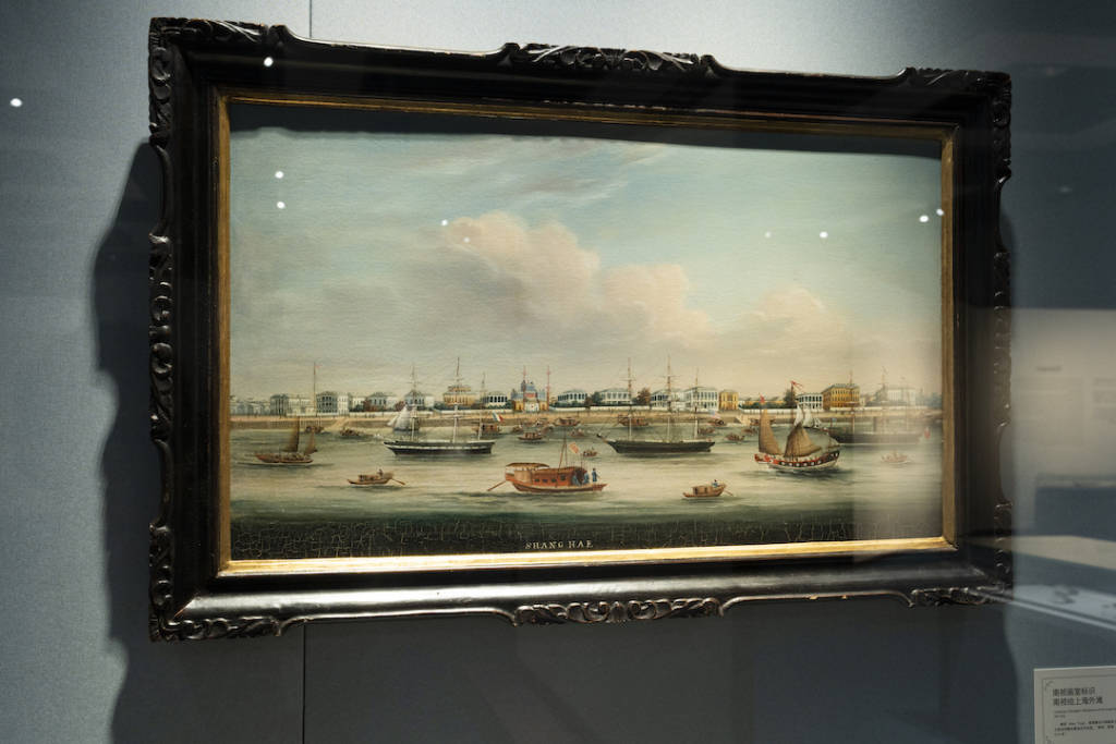 展览中一组珍贵的“外滩图像”,还原了上海开埠初期的外滩风貌,吸引观众驻足观看。这幅标注了来自19世纪广州著名外销画家南祯画室的外销画,描绘了开埠不久的上海外滩景象。
