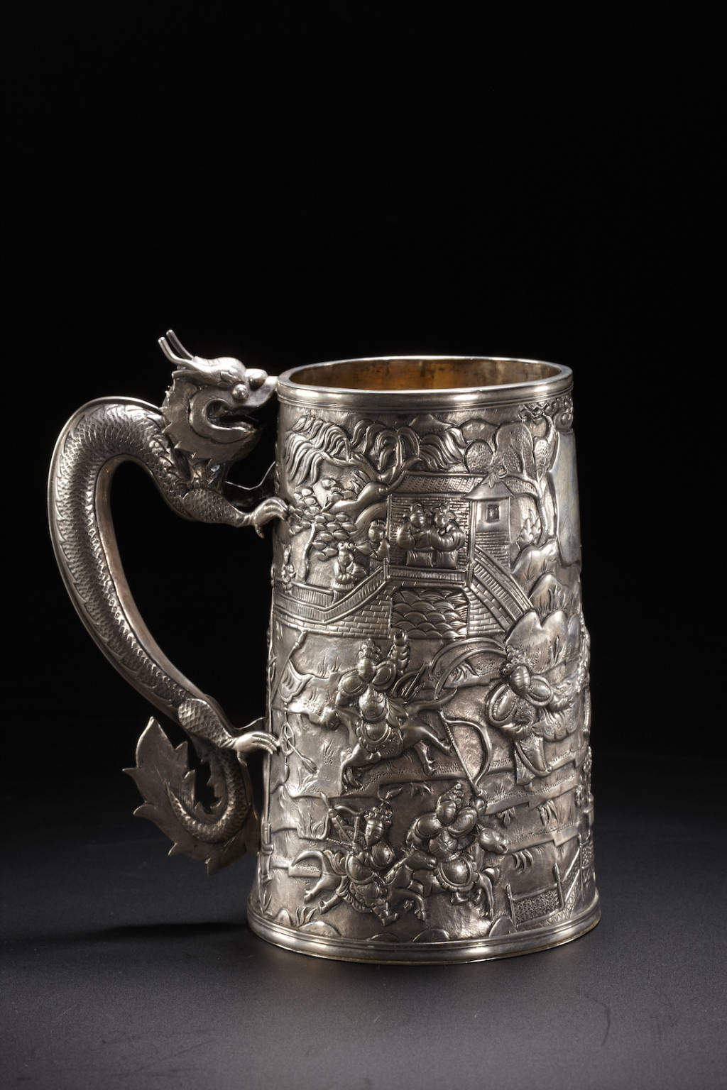 清外销银浮雕人物龙柄“史溢泉、开利店”铭啤酒杯