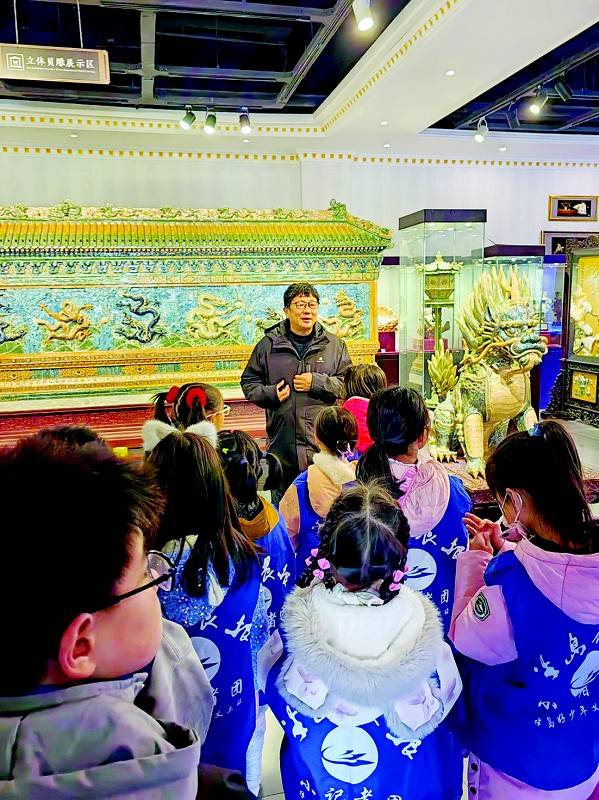 活动中,艺术馆内琳琅满目的贝雕藏品瞬间吸引了小记者们的目光。从气势恢宏的立体贝雕《九龙壁》到精巧绝伦的平贴贝雕画,每一件作品都闪烁着大海赋予的独特光泽。金吉馆长耐心地向小记者们介绍了贝雕的历史渊源与制作工艺。他拿起一块普通的贝壳,讲述了如何通过选料、设计、磨雕、抛光等十几道复杂工序,将天然贝壳变成栩栩如生的艺术品。