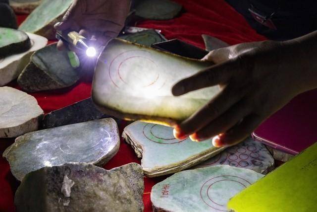 一位从事翡翠生意多年的老板向我们介绍了赌石的流程:“赌石首先要看皮壳,不同的皮壳对应着不同的内部品质;然后用强光手电照射,观察原石内部的种水和颜色;最后再根据经验判断是否值得切割。”他指着一块拳头大小的原石说:“这块原石看起来普通,但皮壳细腻,打灯后有绿雾,说不定内部藏着高品质的翡翠。”旁边一位游客正拿着手电仔细观察原石,神情专注,仿佛在探寻一处宝藏。