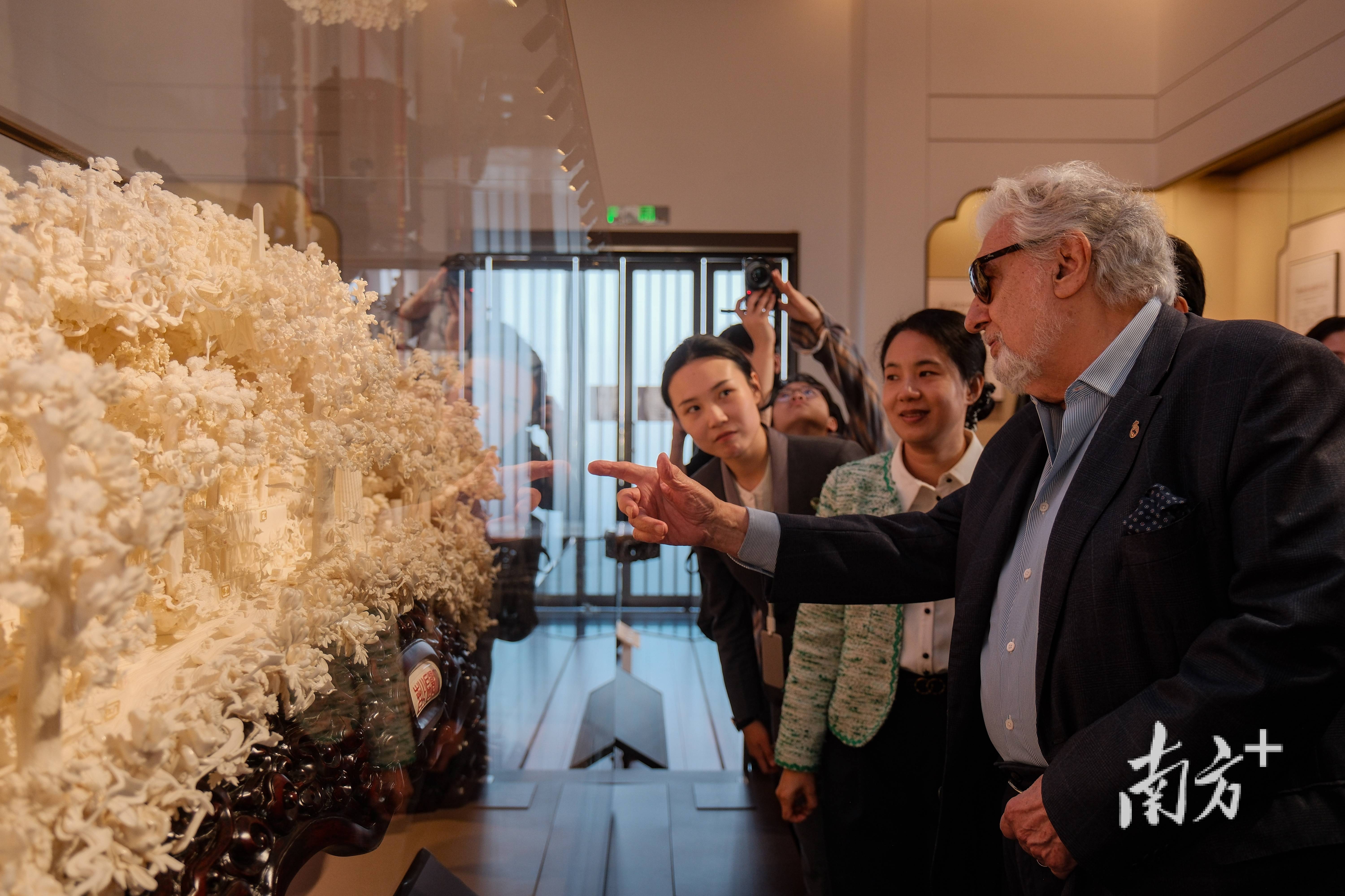 多明戈参观广州市文化馆面塑作品展时,还与萧派面塑第四代传承人进行了交流,感受非遗技艺的魅力。他对馆内展示的面塑技艺赞叹不已:“它蕴含中国很多传统的文化和历史故事,而且制作精细,有的作品要历时几个月才能制作完成,非常了不起。”