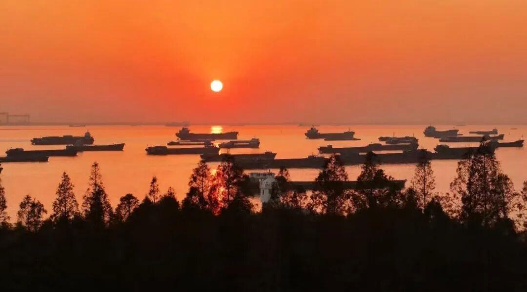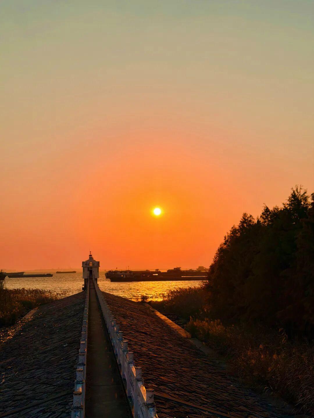 登上木质观景台,视野豁然开朗。眼前是浩浩长江,水天相接处正酝酿着一场盛大的色彩仪式。看落日如鎏金的火球缓缓沉降,将整片水域染成渐变的金橙色——这是崇明赠予你最开阔的告别礼。