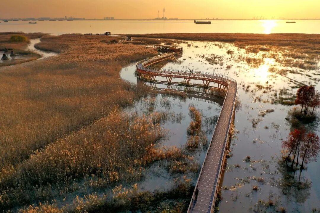穿行在蜿蜒的木质栈道上,两侧的芦苇荡高过人头。夕阳为每根芦穗镀上金边,微风拂过时,整片芦苇荡仿佛被点燃的火焰。以这片摇曳的金色海洋为前景,你的剪影与落日同框,氛围感瞬间满格。