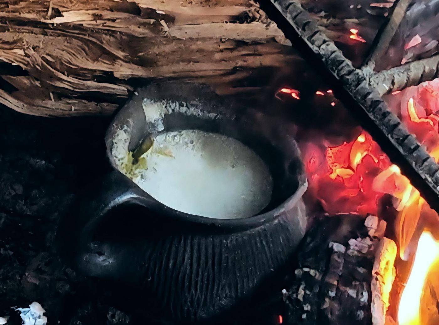 经过翻炒的茶叶、丁香花和芦子,逐渐泛起金黄的色泽,散发出岁月沉淀的古老气息。罗啊三把滚烫的山泉水倒入其中,瞬间热气升腾,裹挟着时光的回响。他握着土罐耳柄轻轻晃动,让原料与泉水充分交融。