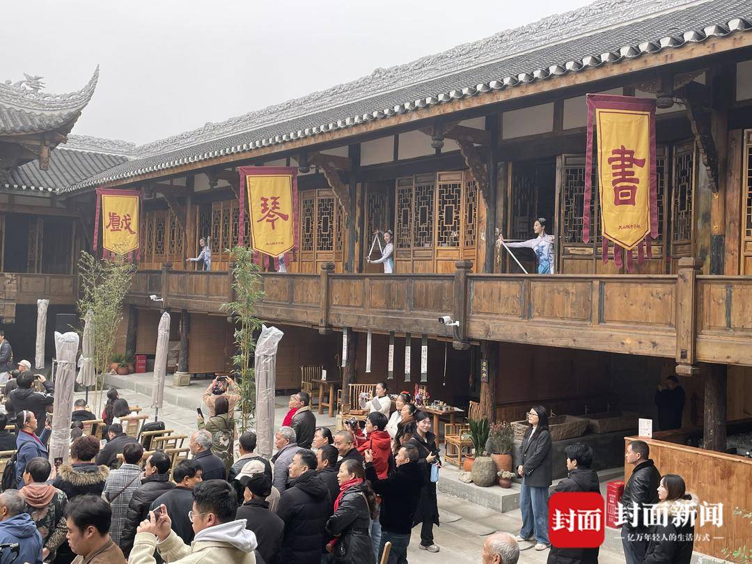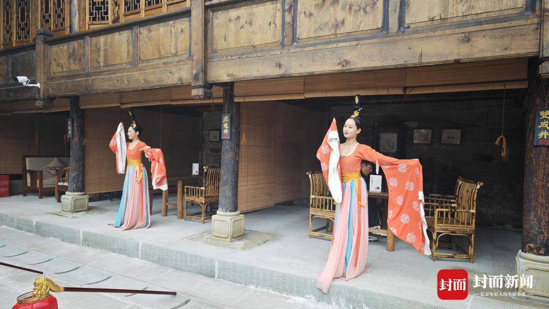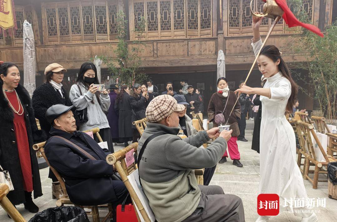 随后,几名身着汉服的舞蹈演员表演了极具特色的《阁楼开窗》,说书人表演了四川评书。现场,茶客们坐竹藤椅、喝盖碗茶,认真地欣赏着节目。
