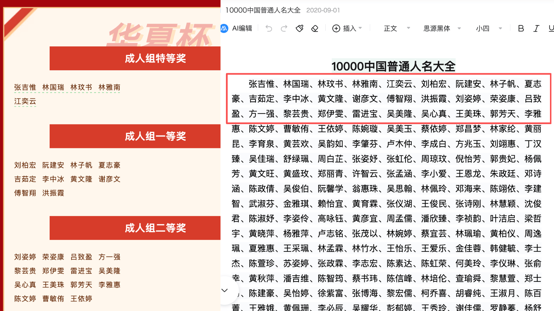 上述网友发布的图片显示,该书法比赛公布的“成人组特等奖”“成人组一等奖”等奖项的获奖者姓名,与数年前网络流传的“姓名大全”高度相似,甚至连顺序也几乎一致。而“学生组特等奖”的获奖者姓名,则与“广州市花都区新华中学”微信公众号于2021年发布的文章《1994届初、高中学生花名册和毕业照》中1994级初一(1)班的姓名有部分重合。