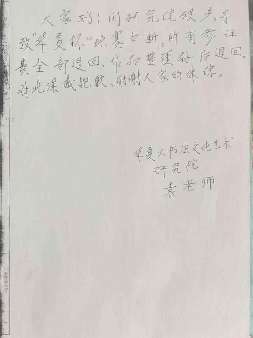 12月4日下午,记者联系上主办方华夏大书法文化艺术研究院,其工作人员表示,院方正在退还所有的参评费用。对获奖名单造假的原因,该工作人员一开始声称不太清楚,后又给记者发送了一张手写道歉信,落款为该研究院负责人袁老师。