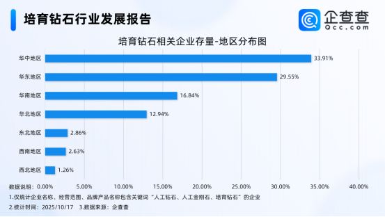 与传统钻石回收市场的困境一样,培育钻石市场同样面临挑战。根据贝恩咨询的《2025全球钻石报告》,培育钻石裸石 市场规模大幅缩水52%,曾经火热的培育钻石裸石市场也光环不再。企查查数据显示, 国内现存培育钻石相关企业873家,近六成是成立10年以上的老牌企业。这些企业多集中在华中地区和华东地区,分别占比33.91%和29.55%。在注册资本方面,培育钻石企业多为轻量级企业,注册资本在100万元以内的企业占比达30.68%。然而, 新企业注册量却显疲态,2024年仅新增15家,今年以来更是只有7家。